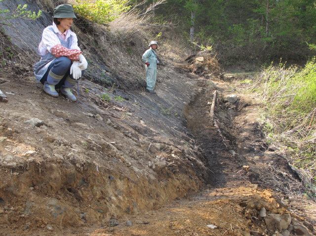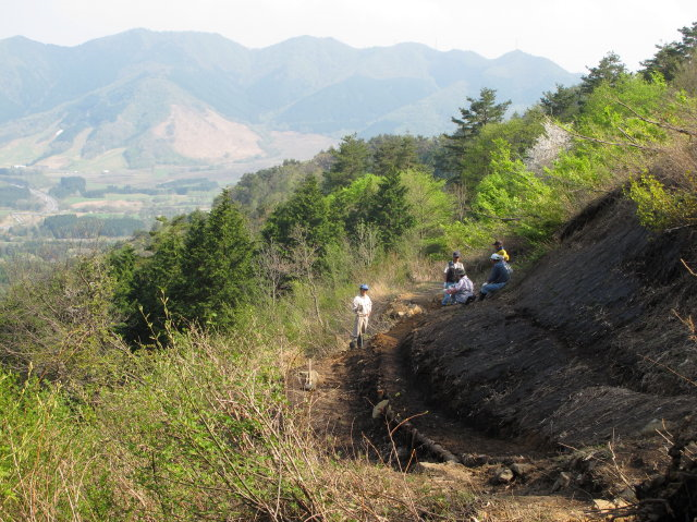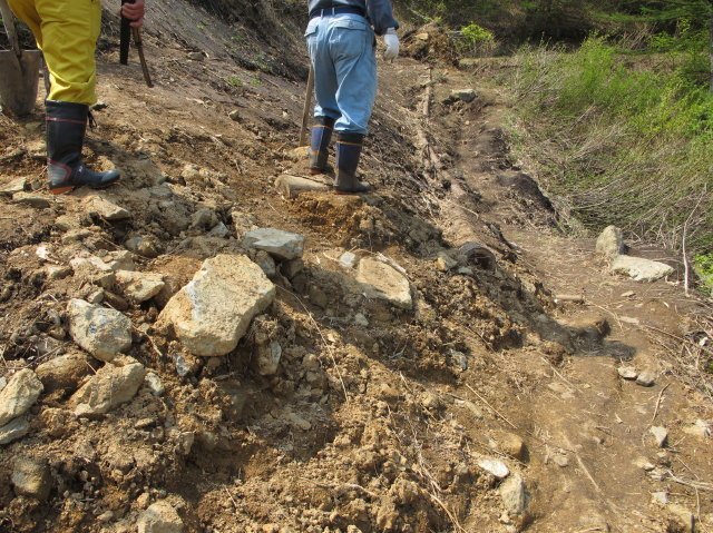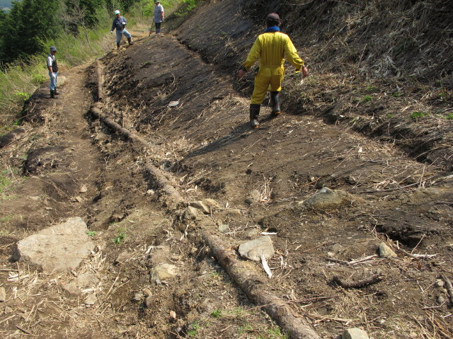 5月5日ガイドクラブ有志9名により雪崩れにより流された登山道の応急修理を行いました。昨年も雪崩れにより流された所が今年もまたやられました。三平山は禿山なので例年同じ所に雪崩が発生し、今年のように雪が多い年は登山道が流されてしまう、こんな所に道を造ったほうが悪いというわけですね。とにかく「イタチゴッコ」ではありますが又来年もでしょうね。上蒜山登山道の補修は5月10日の予定です。