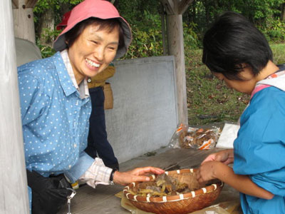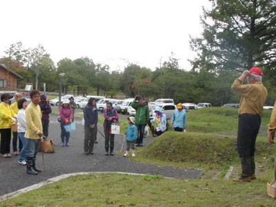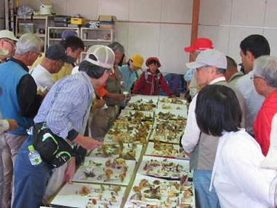 10月12日 長沢先生を御招きしキノコ鑑定会を予定どおり行いました。 場所蒜山高原キャンプ場の皆ヶ山登山道周辺、参加人員36名(当日参加も含めて41名)と言う盛況、スタッフも子供を含めたら15名ほどになりました。 天候はチョット時雨模様ながら雨が降ることはなく(林の中では気がつかなかったがちょっとふったようです)、冷たい風も山の木々が防いでくれてちょうど良い陽気でした。 茸の出具合は気温の高い日が続いたのであまり芳しく無い状態ですが、皆さんの努力でまずまずの収穫、キャンプ場の唐松の根元でまずシロヌメリイグチをゲット、カノシタ、釈迦シメジ、ハタケシメジ、ショウゲンジ(オオシバ)などを採取、勿論毒キノコもかなり、その点は長沢先生がきっちり鑑定、楽しい秋の一日でした。