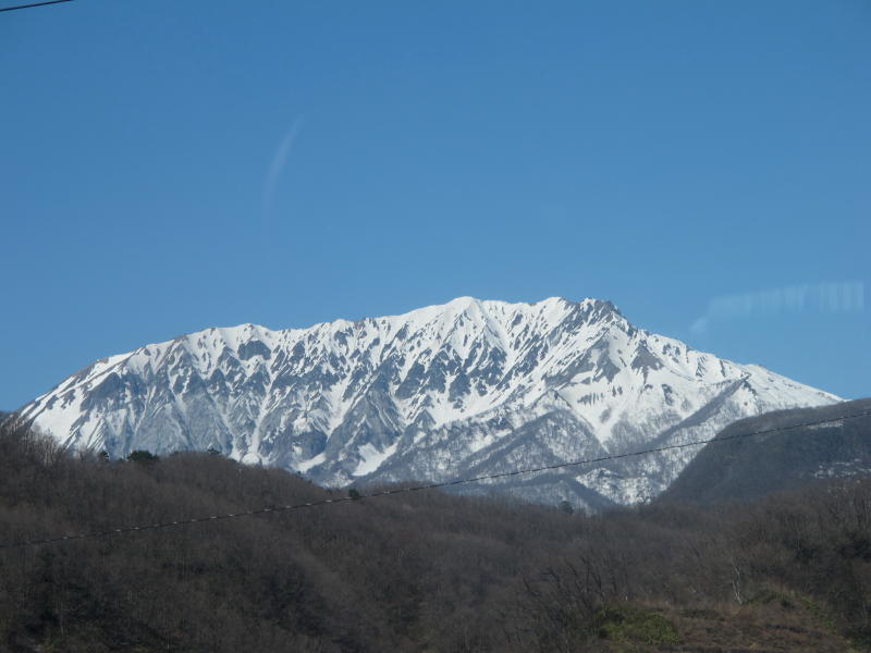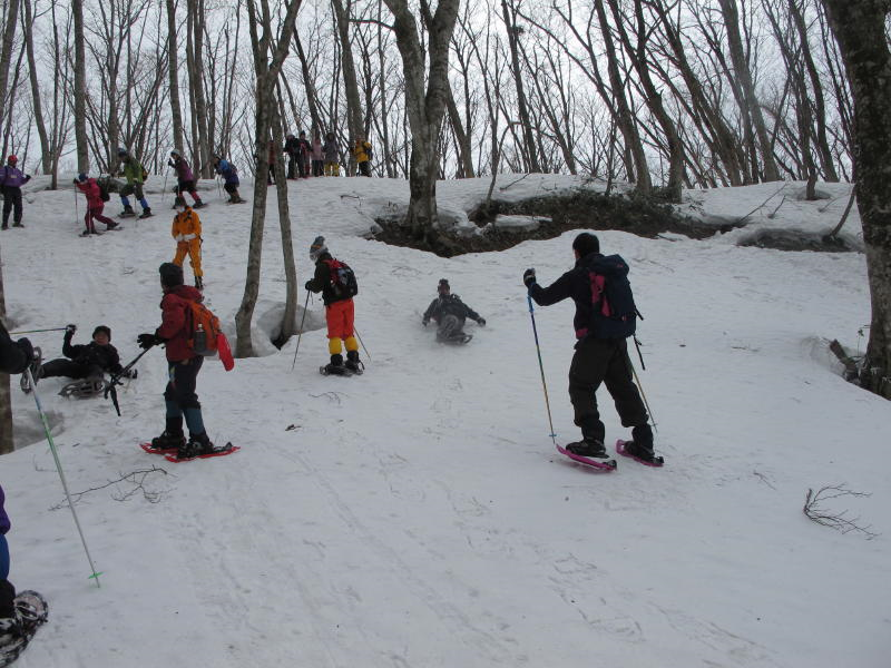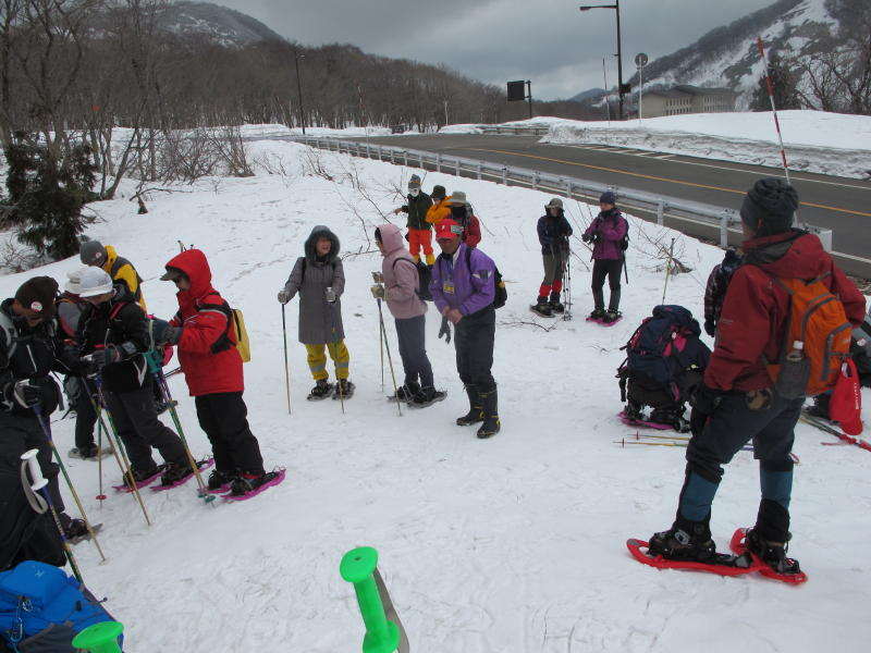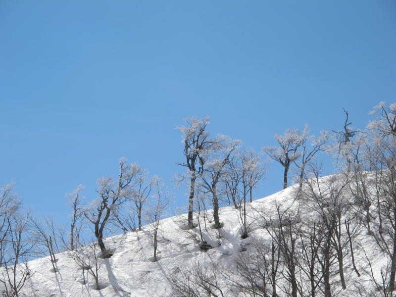 ここで記念写真を撮って稜線まで登り谷底をのぞく、稜線を少し下った風当たりの弱いところで昼食、此処まで来て余裕が出て空を見上げると快晴、稜線のブナには樹氷が真っ白、スカイブルーの空にクッキリ、春先にしては珍しい、一昨日の黄砂が嘘のようです。高齢者が多かったのですが皆さん元気、帰りの沢を渡るところでは腐った雪に大分苦労している方もいましたが予定よりも30分ほど早く全員無事帰着、青空を衝いてそびえる烏ヶ山と大山が今日のスノーシューハイキングを祝福してくれているかのようでした。