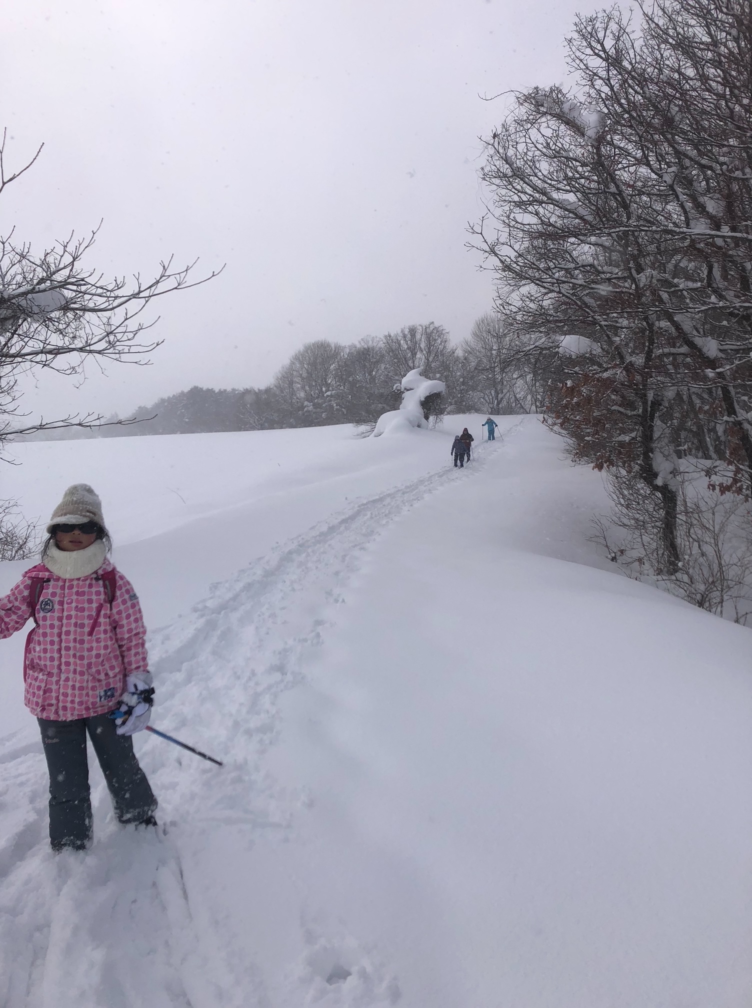 2月24日(月)にクロスカントリースキーのガイドを行いました。天候は時折,青空が見えたり吹雪いたり目まぐるしく変化した。10時に駐車場に車を止め,スタート。コースは,新雪が20cmはありそうなのと初心者の方もいらっしゃるということでキャンプ場・草地・林の中を通るコースにした。新雪もあり転ぶことも多かったが,雪がフカフカで痛くはないけれど起き上がるのに苦労。白一色の景色にきれいと声が上がる。下りは転ぶことも減り上手に滑ることができました。