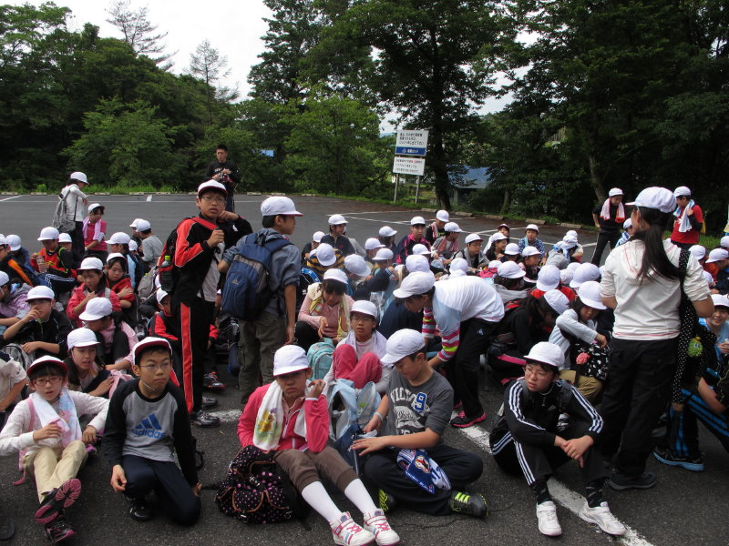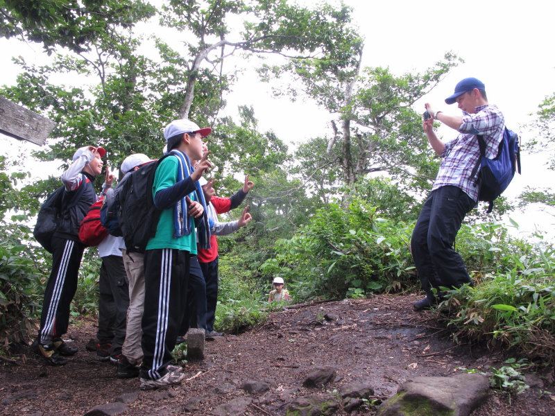 7月12日城南学園小学校5,6年生140名(山北校長他9名とカメラマン2名)の中、上蒜山縦走ガイドに行ってきました。ガイドは池亀、友金、入澤の3名、梅雨末期、大雨が心配だったのですが幸運にも夜半の雨は明け方には止み薄日も漏れるという好条件(熱中症が心配)。いろいろありましたがともかく中蒜山へ全員登頂、山頂ではイブキトラの尾やタテハチョウ、が 御出 迎え、此処で体力不足の数名は下山、イブキトラの尾とアザミの道を上蒜へ、 中蒜、上蒜鞍部 途中で赤ジムグリ タテハチョウの交尾の御出迎えもあり無事上蒜山頂 、笹ユリ の残花に出会い、ツルアリドウシを足元に見て8合目 までは順調、 此処からの下りでは滑って転ぶもの続出、恐怖心で足の出ない子も、先頭グループはほぼ時間どうりに下山したのですが最後尾は1時間遅れ、それでも全員自分の足で下山、天候にも恵まれまずは完全縦走オメデトウ。これだけの大人数での2座縦走、全員自分の足で登り、自分の足で下山は何も言う言葉がありません。皆良くがんばりました。