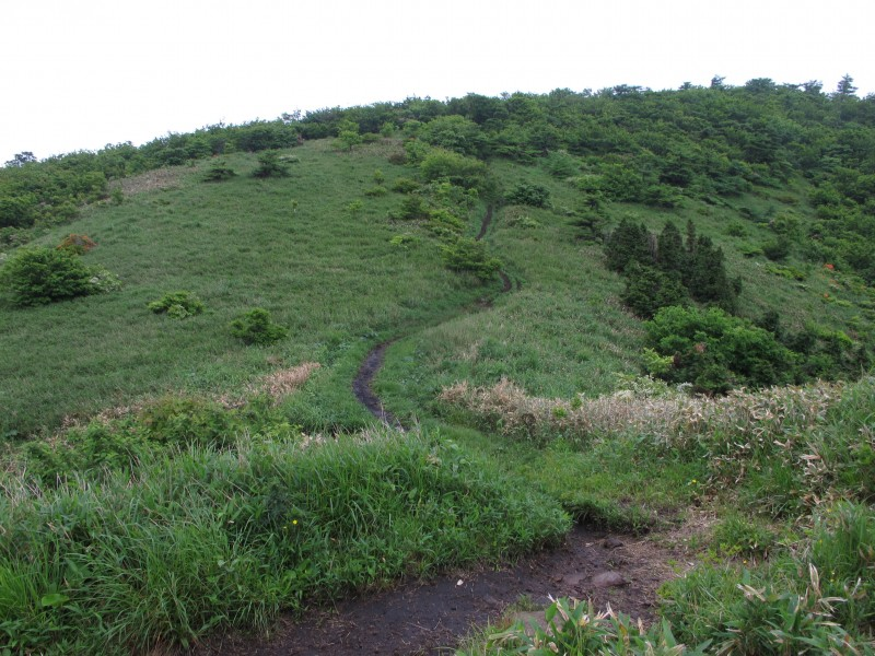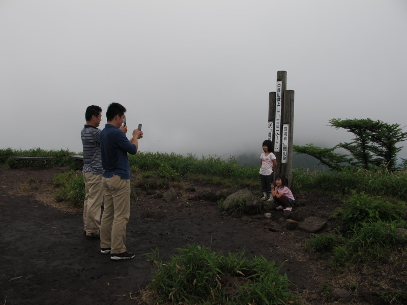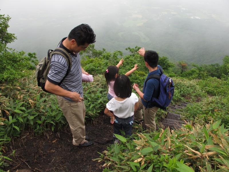 中蒜山頂までおよそ2時間、此処までは子供たちも元気一杯、下蒜に向かってヤホーと元気に声を掛けこだまを楽しんでいました。中蒜山頂で昼食の後、上蒜に向かいましたが上蒜の登りでは子供たちも終始無言、父親に手を引かれ必死に頑張り無事上蒜山頂(およそ一時間)、二人ともなかなか我慢強い。上蒜よりの下りは身の軽い子供よりは大人が問題、朝まで降っていた雨の影響でよく滑る、大人二人は履物の不備もあり5~6回は転倒、お知りや手を打撲、其処は男、子供の手前もあってぐっと我慢(たぶん、風呂で御互いの青タンを自慢?)とにかく小一と年長さんの頑張りに乾杯です。