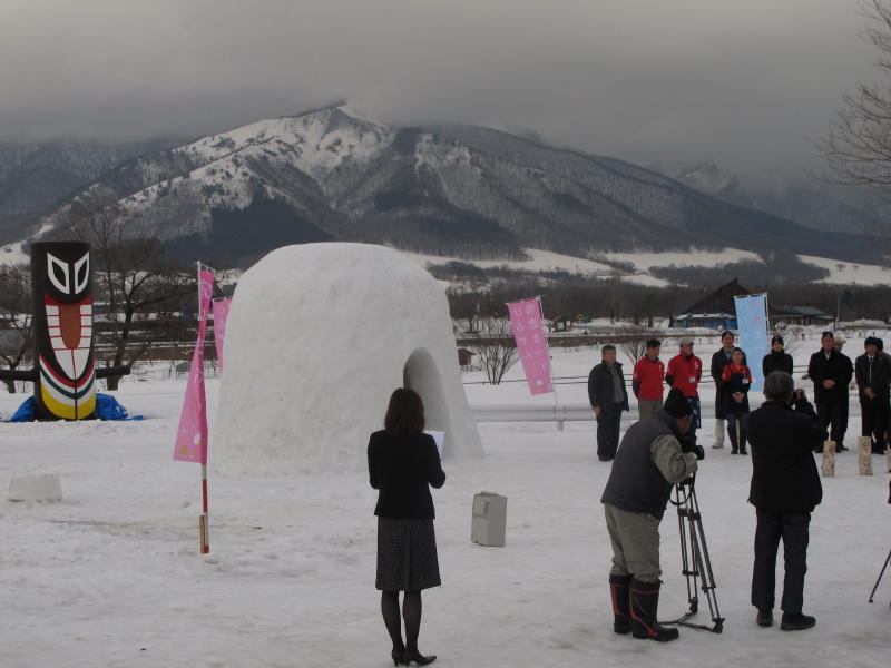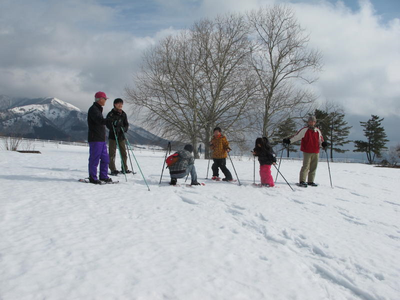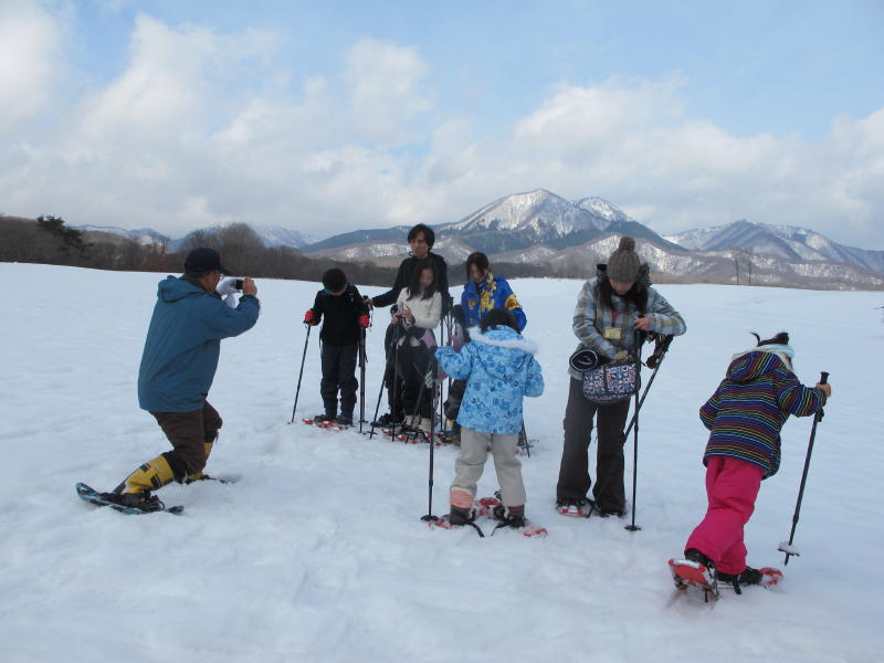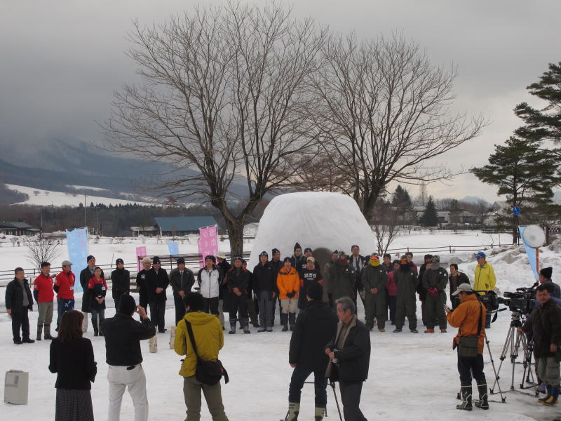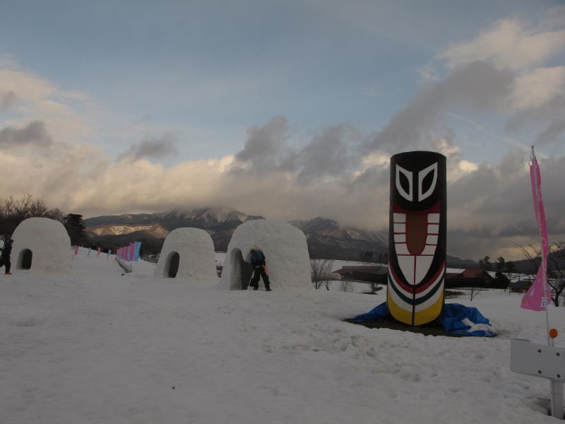 「カマクラ」で有名な横手よりカマクラつくりのプロ?に来て頂きその指導の下、高さ3mのカマクラ5基、ミニカマクラ数百基、蒜山ヤキソバや横手ヤキソバ、コンサートなど多彩な催し、ガイドクラブもスノーシュウ無料体験を実施、スタッフ4名で2日間に100余名にスノウシュウを体験していただきました。一人4~5回案内し昼食を摂る暇も無い忙しさでした。